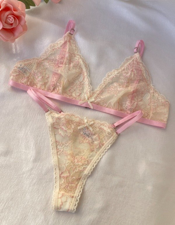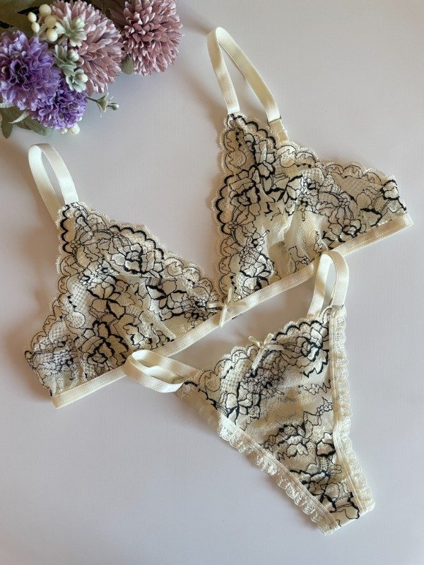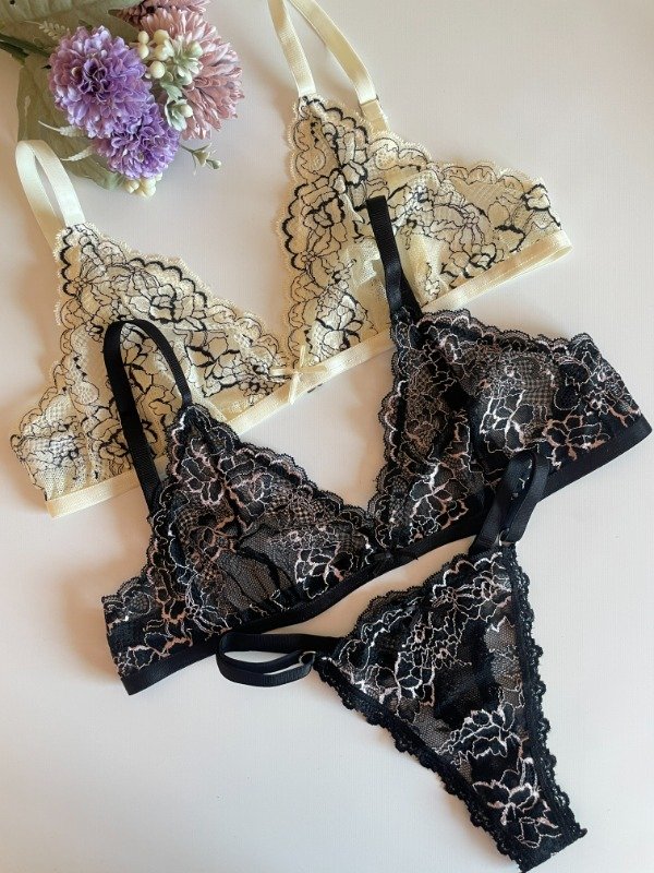 Modelo triangulito con coleta confeccionado en puntilla, breteles regulables y broche tipo gancho en la espalda.